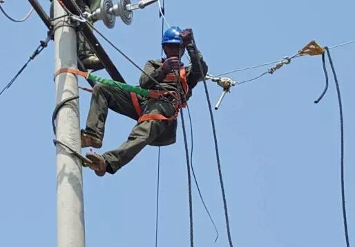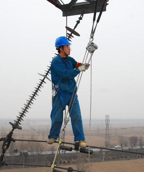 電力設(shè)施檢修電力工人攜帶鋁合金手扳葫蘆檢修作業(yè)...